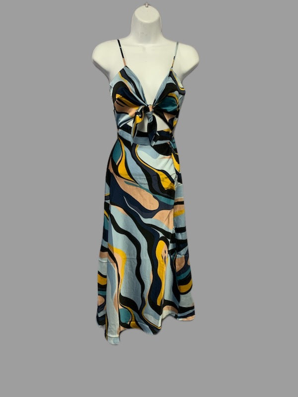 This is a lightweight dress with a side slit. that ties in the front. Fits true to size.