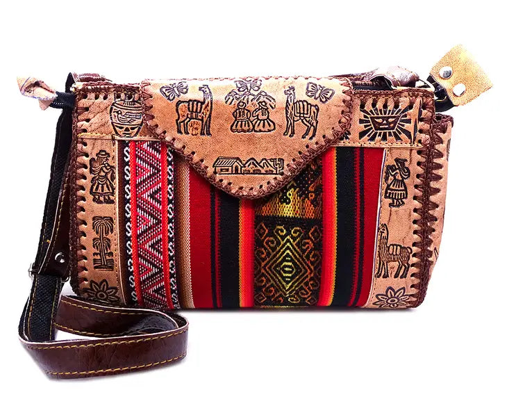 Handmade large leather material bag with adjustable strap. Made in peru
