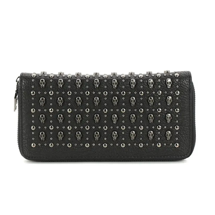 Skull studs wallet in vinyl Features: High quality vinyl material and uniquely designed; Zipper pull is shaped like a skull head; Zippered main closure, 3 divided compartments; 1 zippered compartment that is perfect for coins, 8 card slots, 2 bill pockets.