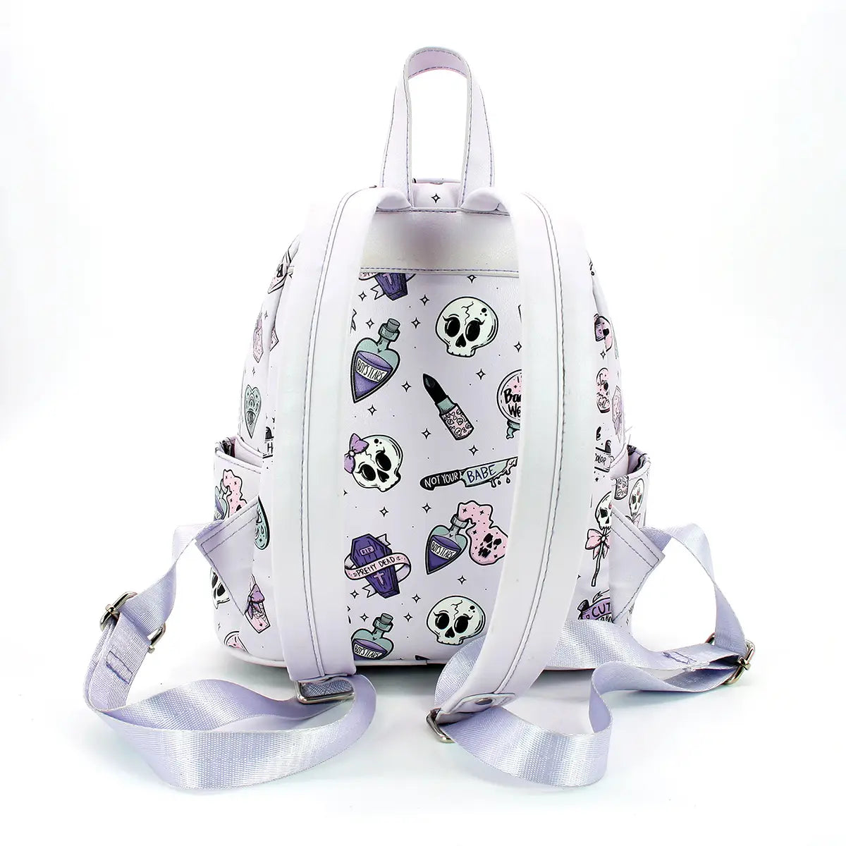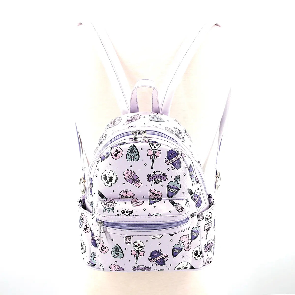 Spooky Girl mini backpack with all the cute Halloween graphics. Adjustable shoulder straps. Front zip pocket. Faux Leather material. Size: 9"x5"x9.5".