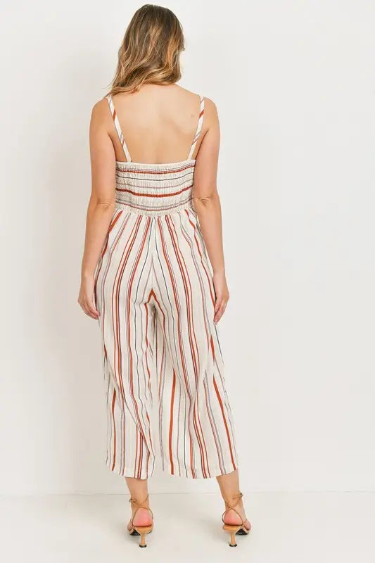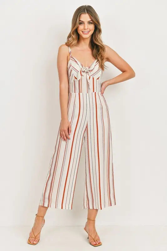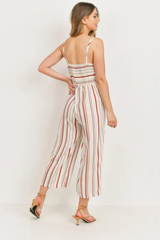 A striped linen jumpsuit with a sweetheart neckline and front tie. Adjustable spaghetti strap and smocking back detail. Model is Wearing Small