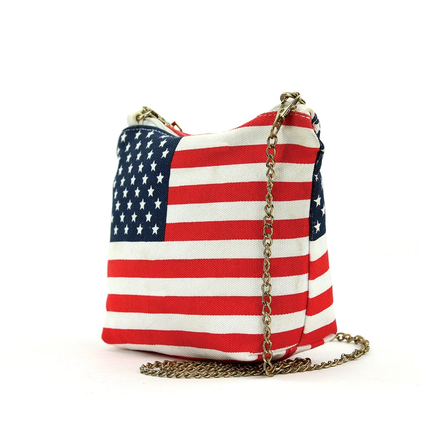 Celebrate American pride with the uniquely designed American Flag Crossbody Bag. Made with quality canvas material, this bag includes a 22" chain strap drop and top zippered closure for added security. Its fabric lined interior measures 8" (L) x 3" (W) x 8" (H), making it the perfect size for your essentials. Show your love for the USA with this stylish and functional bag.