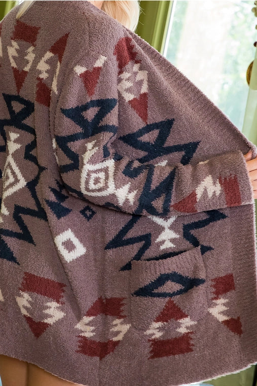 Rock this Aztec Cozy Soft Cardigan this fall and winter! Made from a super-soft sweater knit fabric, it features an open front, long sleeves, and two pockets. The relaxed fit is totally effortless and seriously comfy. Plus, it's a bestselling style with an eye-catching Aztec print – what more could you want!?
