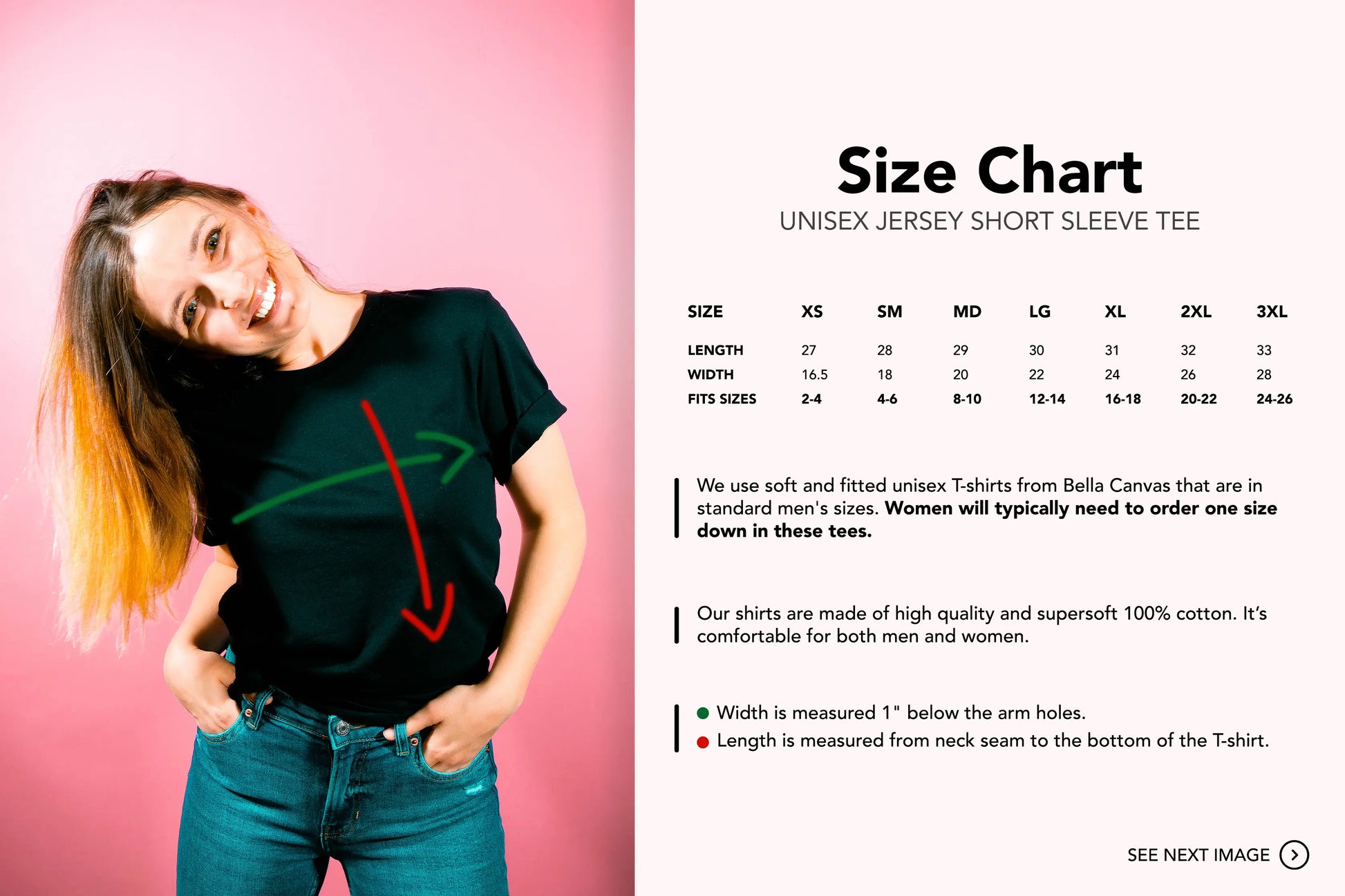 - Please consult size chart in pics for accurate fit. Please keep in mind that there are always slight variations in sizing. - Remember unisex tee's fit on the bigger side.