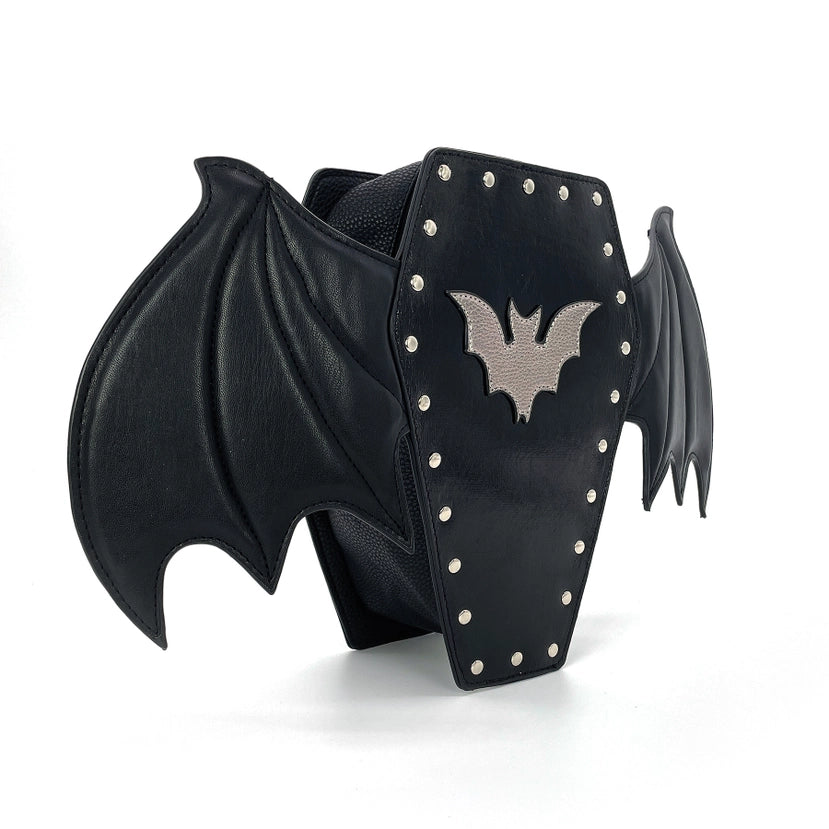 The Bat Coffin Backpack is made from quality vinyl material and boasts a unique design that is sure to turn heads. With an adjustable 26" shoulder strap and 15" backpack strap, this bag offers comfort and versatility. The secure zippered closure and fabric lined interior ensure your belongings stay safe and organized. Measuring at 8.5" (L) x 5" (W) x 12" (H), it's the perfect size for all your essentials. Make a statement with this one-of-a-kind backpack!