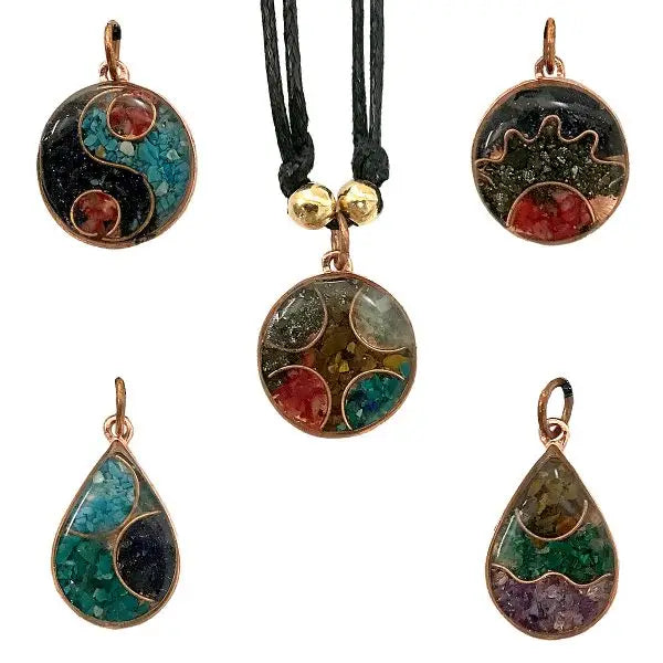 These handcrafted necklaces are made from copper metal with a unique design using chips of pottery and stones.