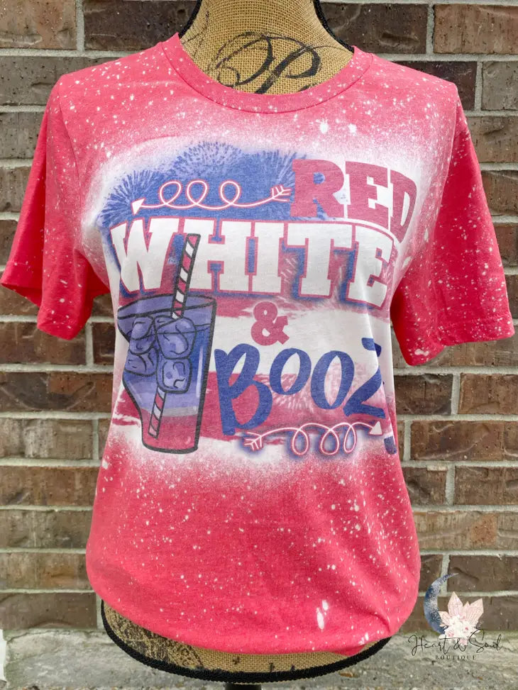 Red, white and boozy bleached t-shirt This is a unisex bella-canvas poly/cotton blend so they are really soft and comfortable. The design is sublimated on the shirt so there is no peeling or cracking.