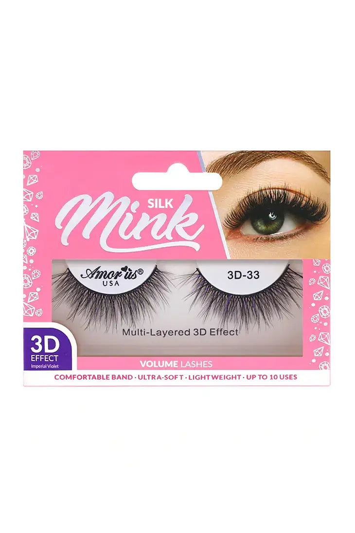 Amor Us USA 3D-33 Silk Mink Lashes. Features full volume multi-layered 3D effect, synthetic fibers, a comfortable lash band, ultra soft and light weight lash. Up to 10 uses.