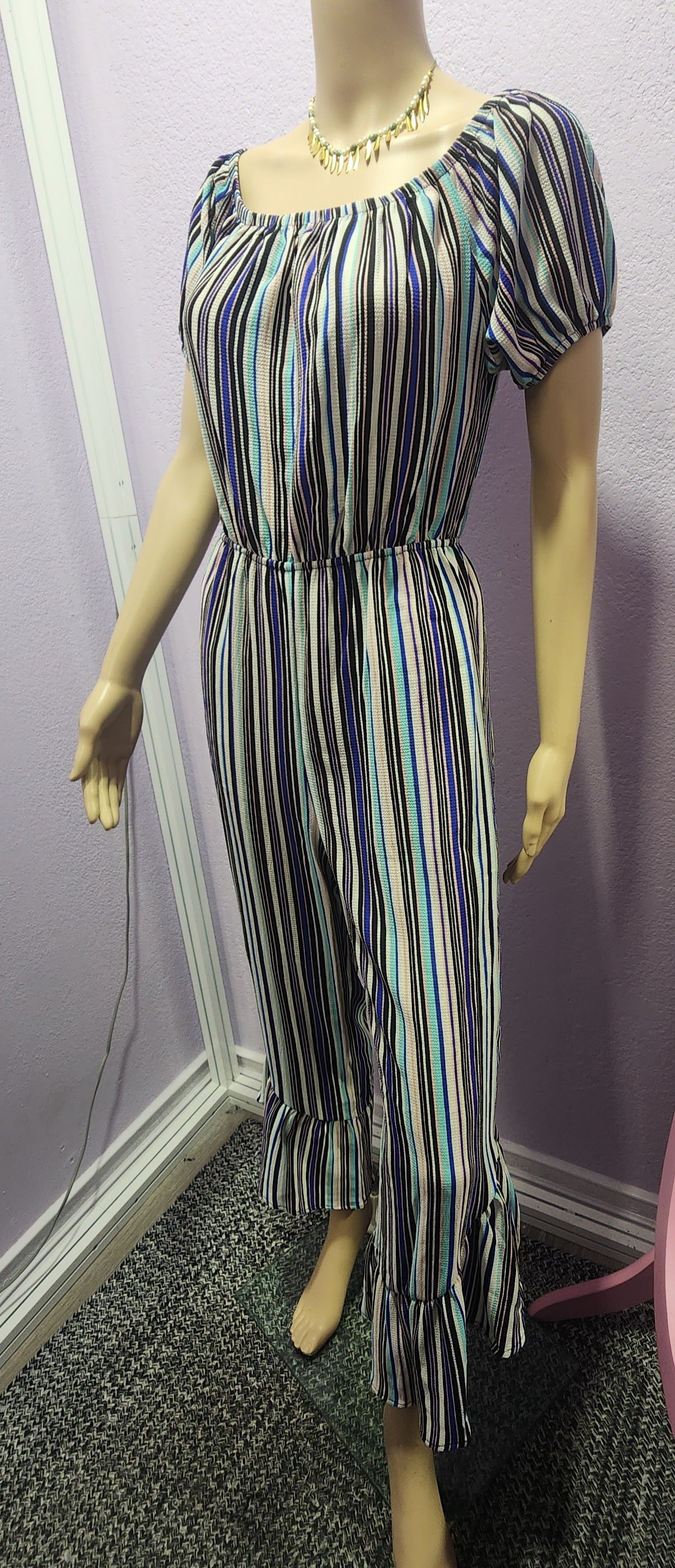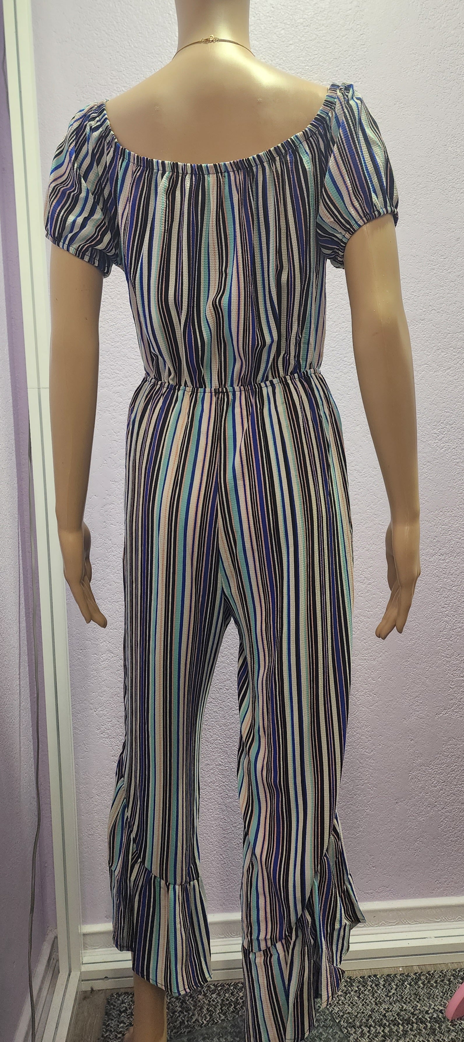 Turn heads in this bold striped jumpsuit! Stand out with playful colors and flared legs for a look that's sure to make a statement. Be confident and stand out from the crowd.