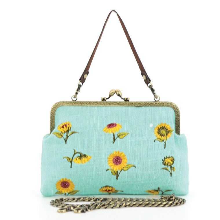 FEATURES: High quality canvas material and uniquely embroidered designed, Kiss lock closure, fabric lined interior, 1zippered inside pocket, 1 regular inside pocket, 5in detachable leather strap, 26in drop chain strap.